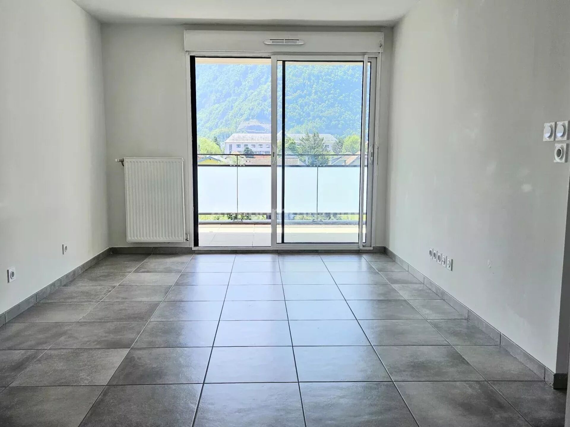 Les baies vitrées donnant directement sur la belle terrasse permettent de profiter pleinement de la luminosité ainsi que de la vue dégagée sur les montagnes.